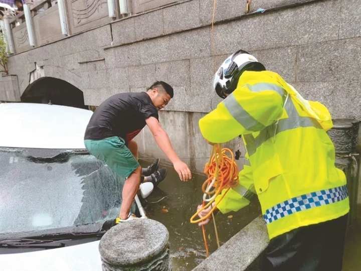 時間緊迫,眼見車子順著水流漂向橋洞,曹金標果斷更換救援方案。他徒手上陣,一手抓緊車輛方向盤,一手扶住橋側(cè)邊的大理石,用力調(diào)整車輛漂移方向,一點一點將車子挪向岸邊。接到報警趕到現(xiàn)場的如皋市公安局如城交警中隊民警劉偉偉、輔警盧樹森、黃金珍在岸邊協(xié)助。車子靠岸后,大家齊心協(xié)力將駕駛員從車內(nèi)救出,沒多久車子便被河水淹沒。