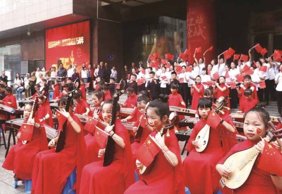 10月1日,南通百名琴童在市區(qū)文峰大世界廣場(chǎng)奏響《我和我的祖國(guó)》,向偉大祖國(guó)獻(xiàn)上誠(chéng)摯祝福。當(dāng)天是新中國(guó)成立75周年,南通街頭滿眼“中國(guó)紅”,處處洋溢著喜慶祥和的節(jié)日氛圍。記者尤煉