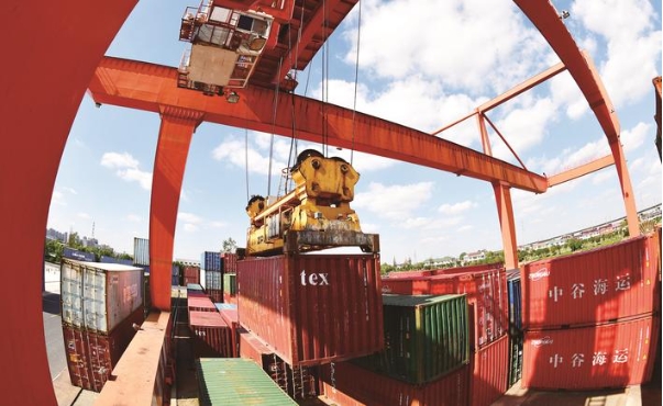 6日,海安市鳳山港碼頭船來車往,起重機(jī)械有序裝卸著集裝箱和貨物,一派忙碌景象。