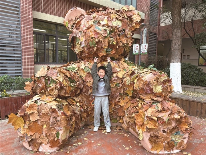 “這只熊身上所有的葉子都是孩子們親手貼上去的,是全校共同完成的作品?!狈綕嵱裱a(bǔ)充說(shuō)。 記者高陽(yáng)