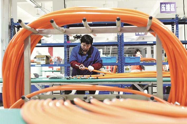 昨天,工人在海安高新區(qū)內(nèi)的江蘇恩達(dá)通用設(shè)備集團(tuán)車間趕制新能源乘用車高壓線束訂單。正值年末,海安各工業(yè)企業(yè)開足馬力搶效率、趕訂單、忙生產(chǎn),全力沖刺“全年紅”。 顧華夏攝