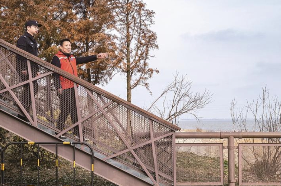 一江碧水,浩浩東流。24日下午1時(shí)許,穿上紅色志愿者馬甲的邢衛(wèi)全和新警許俊軍頂著寒風(fēng),在海門青龍港寬闊的江堤上行走。