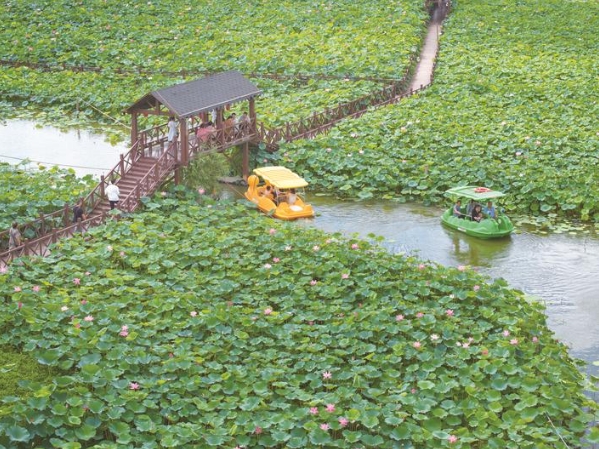19日,游客在如皋市平園池村千畝藕池文化園賞荷游覽。近年來,平園池村積極打造荷藕產(chǎn)業(yè)鏈條和荷鄉(xiāng)旅游品牌,獲評中國美麗休閑鄉(xiāng)村、全國鄉(xiāng)村治理示范村、全國文明村等。 記者 許叢軍攝