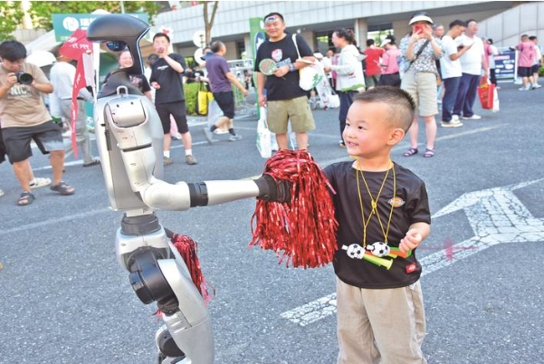 19日,南通足球訓(xùn)練中心如皋基地場(chǎng)外,人形機(jī)器人與球迷親密互動(dòng)。當(dāng)天,人形機(jī)器人、智能機(jī)器狗與球迷互動(dòng),點(diǎn)燃全民足球熱情。 吳樹(shù)建攝