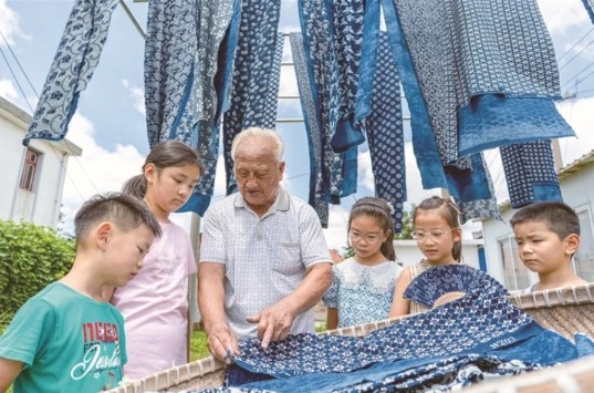 昨天,在通州區(qū)二甲鎮(zhèn)正興染坊,國家級非遺——南通藍印花布印染技藝傳承人王振興向孩子們介紹藍印花布的制作技藝。暑假期間,二甲鎮(zhèn)新時代文明實踐站組織小學生們開展藍印花布體驗活動,讓孩子們近距離感受傳統(tǒng)技藝魅力,傳承非遺文化。 翟慧勇攝