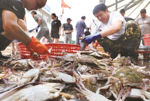 昨天,啟東呂四漁港迎來(lái)首批收鮮船回港高峰,數(shù)十艘滿(mǎn)載漁獲的收鮮船陸續(xù)返回漁港碼頭,漁民們忙著卸運(yùn)伏季休漁后的“第一捕”約500萬(wàn)斤梭子蟹、金鉤蝦等海產(chǎn)品。 記者 許叢軍攝