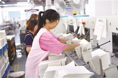 新學(xué)期臨近,昨日,承接部分江蘇省和南通市中小學(xué)教材教輔900萬(wàn)余冊(cè)印刷任務(wù)的南通韜奮印刷有限公司員工正全力進(jìn)行教輔材料印刷工作,確保在開(kāi)學(xué)之際能夠“課前到書(shū),人手一冊(cè)”。 記者 徐培欽攝