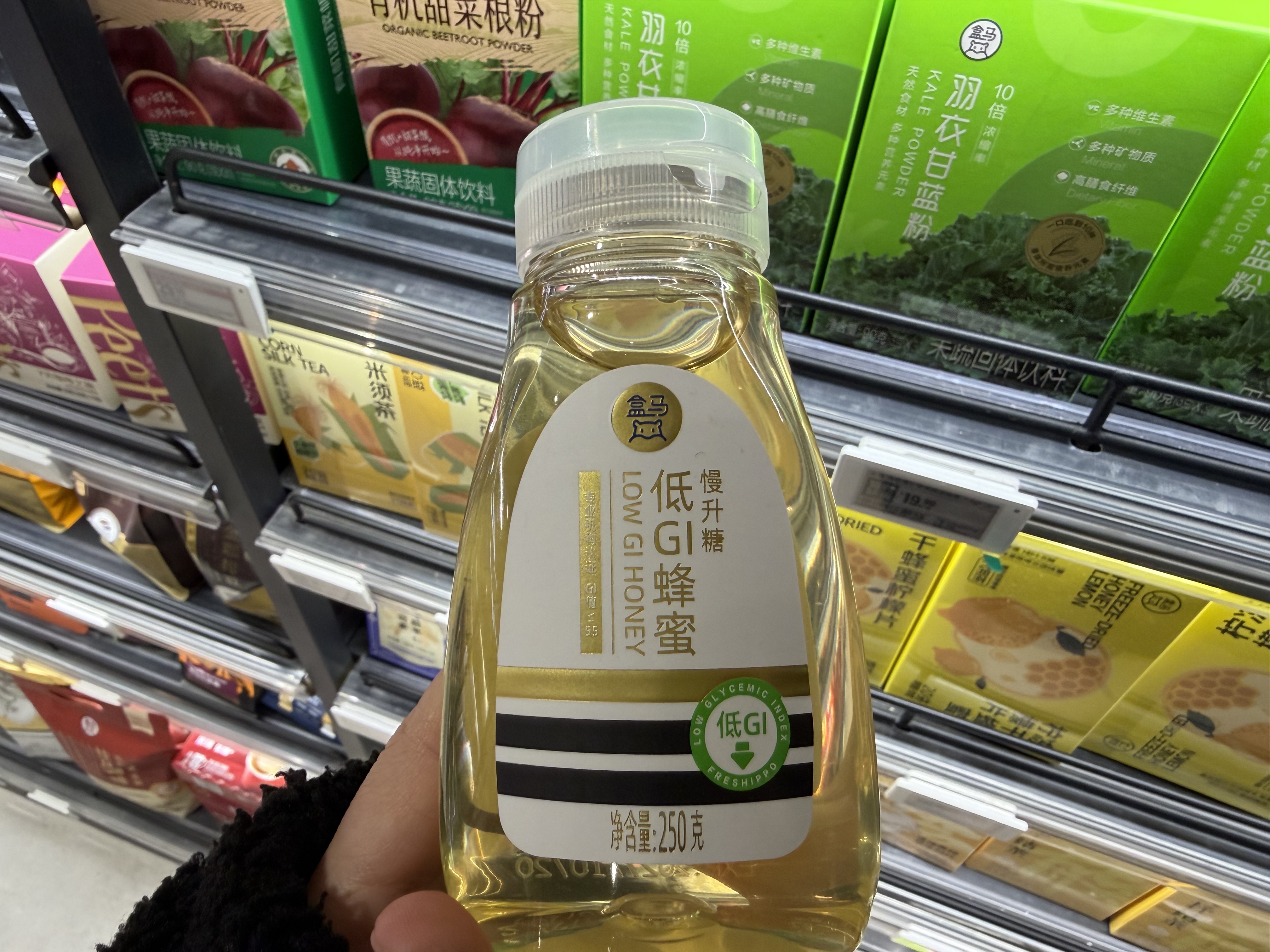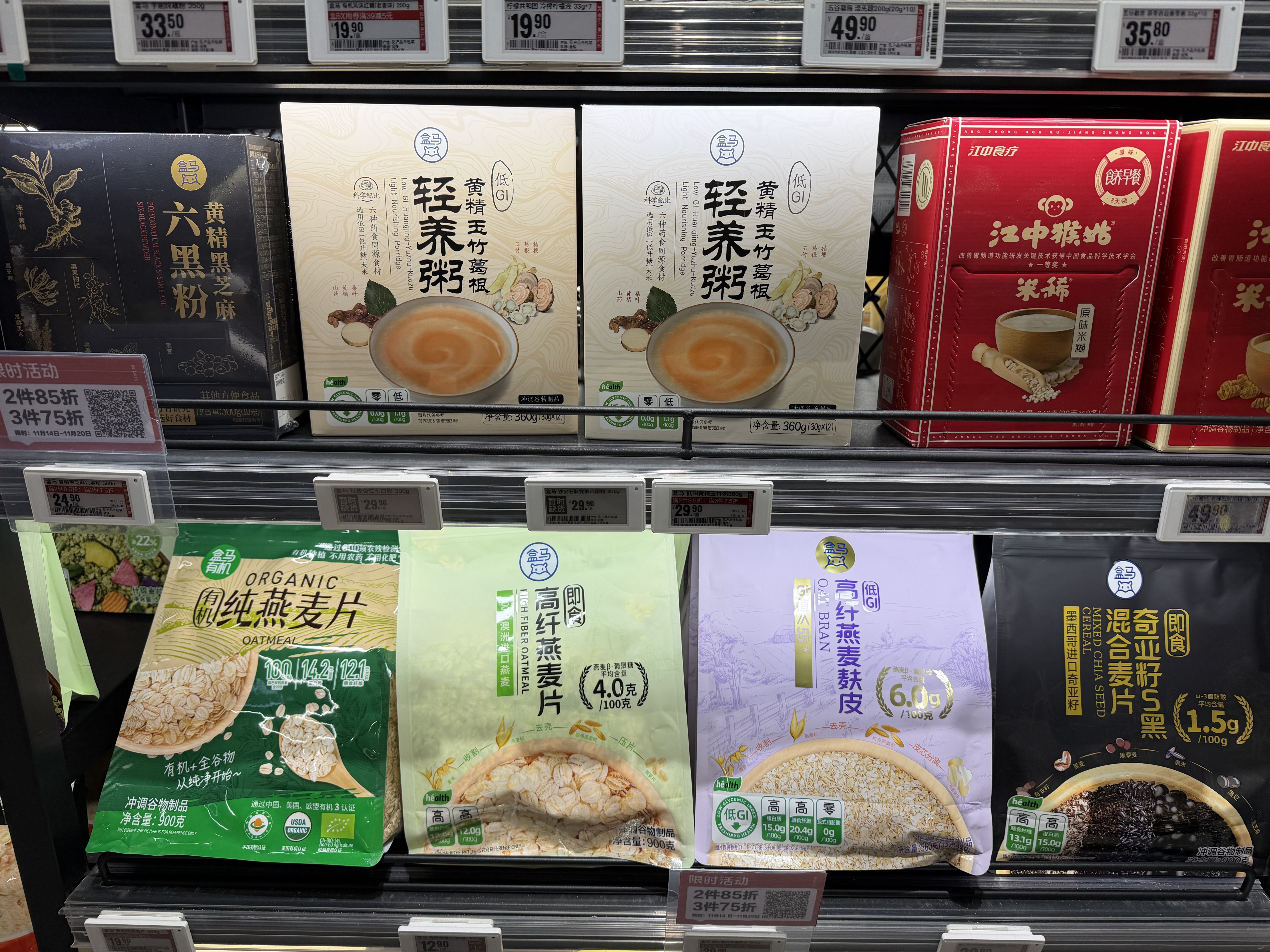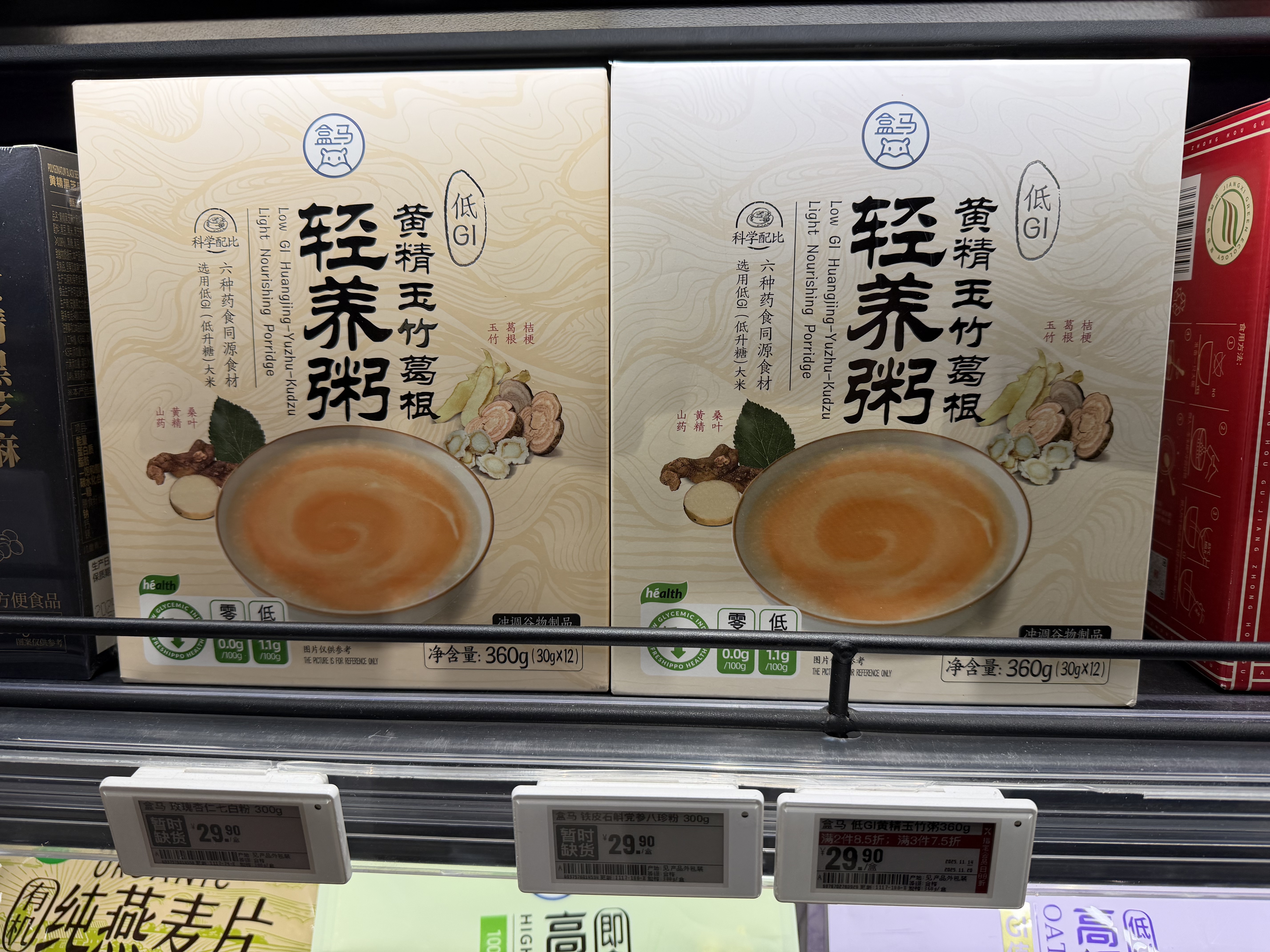 店內(nèi)在售的一款“低GI”黃精玉竹葛根輕養(yǎng)粥,外包裝標注“低GI認證”和“低GI產(chǎn)品認證證書編號:375-DGI-2500002”,GI值不高于55。