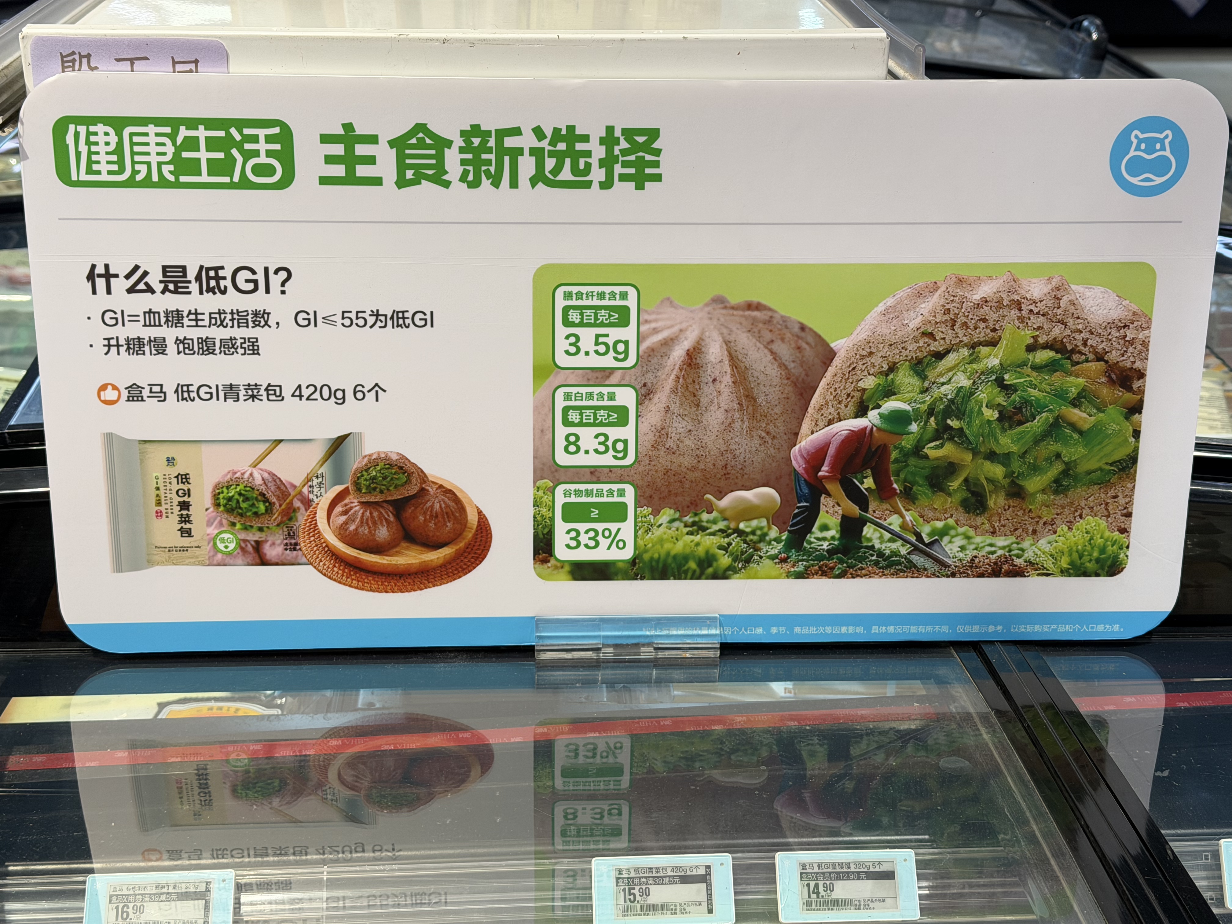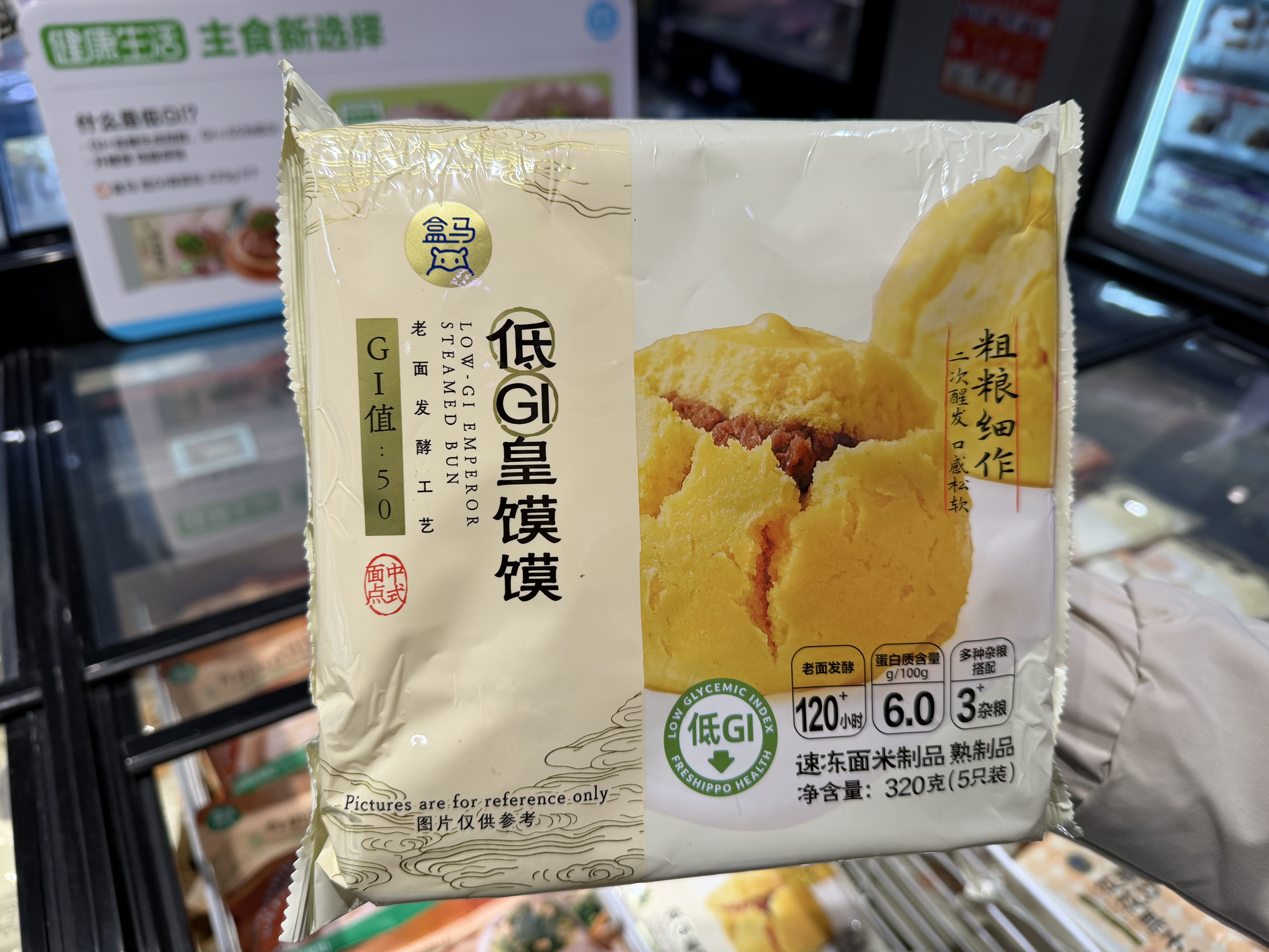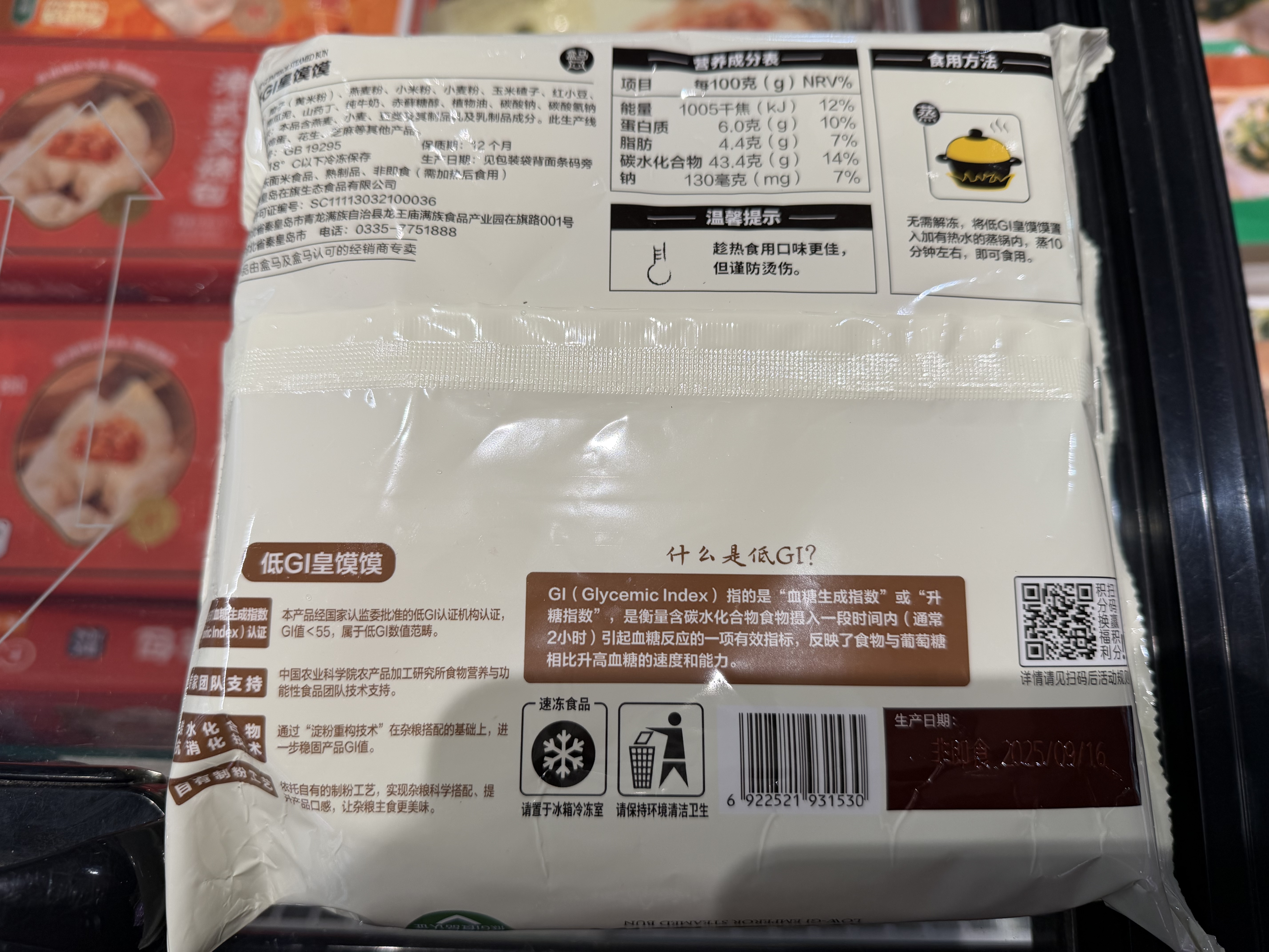 記者看到,一款“低GI”皇饃饃售價14.9元,外包裝標明該產(chǎn)品“經(jīng)國家認監(jiān)委批準的低GI認證機構(gòu)認證,GI值<55,屬于低GI數(shù)值范疇”。旁邊另一款“低GI”青菜包售價15.9元,該產(chǎn)品配料表包含小麥粉、綠豆、黑米、燕麥胚芽米、青菜、香菇、赤蘚糖醇等,包裝同樣強調(diào)“科學認證 升糖慢 放心吃”。